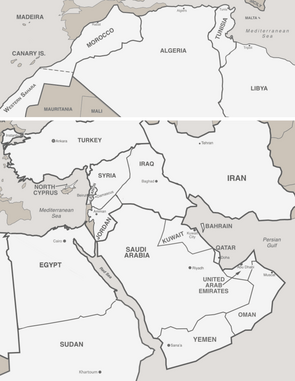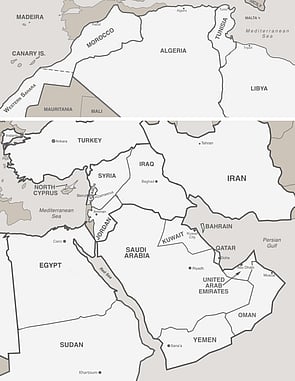 The Middle East and North African Union is comprised of 20 countries. The region is bordered by Morocco to the west, Iran to the East, Turkey to the north and Sudan to the south.